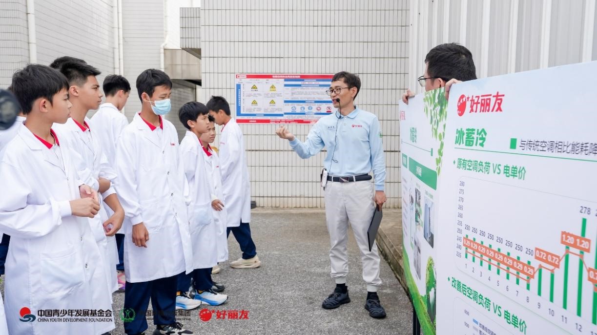 當看到車間頂部整齊排列的光伏板時,工廠環(huán)保負責人介紹:“這些光伏板年發(fā)電量相當于1820個家庭的用電量,每年可減碳2077噸。”在動態(tài)冰蓄冷設備區(qū),巨大的蓄冰罐引發(fā)了孩子們的好奇心:“為什么要在晚上制冰?”通過“階梯電價小課堂”為同學們答疑解惑:“夜間電價低,制冰儲存冷量,白天就能減少機器運轉(zhuǎn)能耗,就像給工廠裝了一個‘節(jié)能冰箱’。”